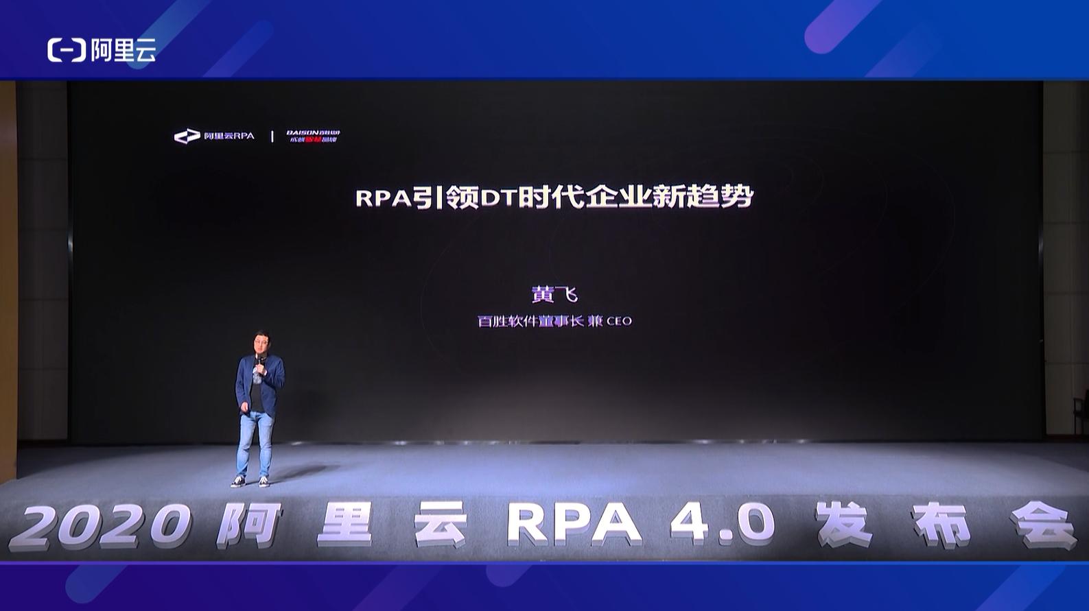 此外,在本次发布会中,百胜软件创始人兼CEO黄飞还发表了演讲,就双方的合作以及RPA发展的趋势进行介绍,他谈到:“RPA作为一个有效的数据处理工具,从诞生的那一刻起就致力于解决人与系统、系统与系统之间的数据连接,可以不厌其烦地处理简单重复的操作流程,提高工作效率和保证质量。而阿里云RPA是目前中国本土最领先的RPA产品,特别是今天发布的RPA4.0应该在各个维度都要领先于国内同行,背靠阿里达摩院的AI技术加持,加上阿里云厚积薄发的研发实力,阿里云RPA4.0将更智能、更稳定、更高效。”他认为:阿里云RPA将成为DT领域的领导者。