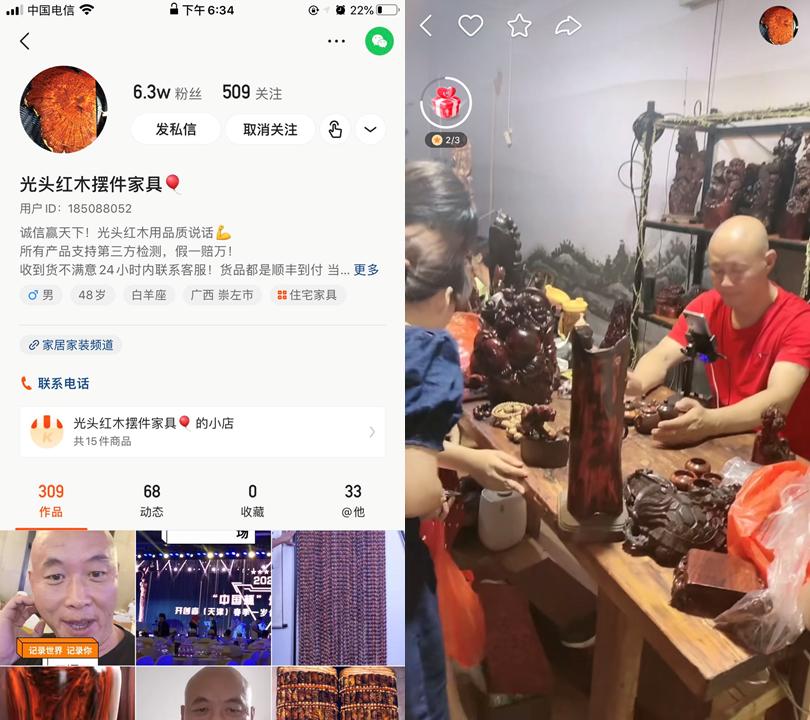 光头是在2017年从零开始学习的红木,近距离看、摸,了解红木的真实质感,辨别优劣,他也把这一套带到直播间,通过讲解红木质量获得粉丝信任,从而在此购买下单,“(粉丝)刚开始不懂,就像我当初一样,但他不会总不懂,等他懂了,知道你卖的是假货,后果可严重了。”