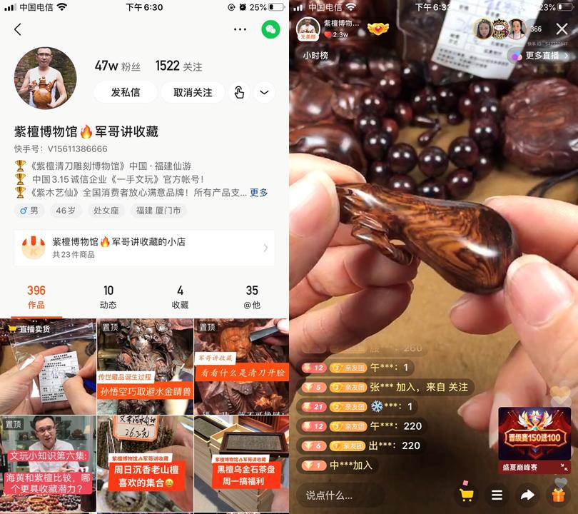 头部主播军哥在快手上拥有47万粉丝,如今近50岁,从事红木行业10余年。曾经在老家河南做红木生意,但线下式微,进货-运输-销售流程的成本增加,军哥决定来到仙游,把面向河南本地的生意做到全国。