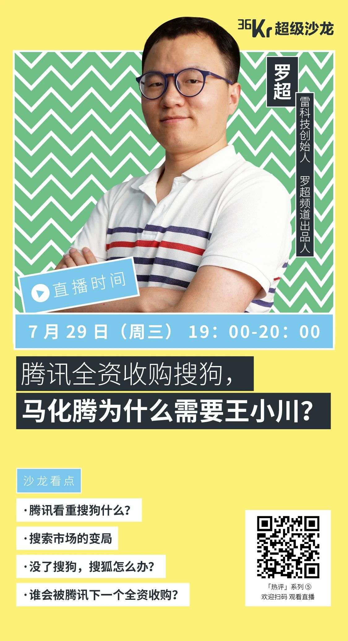 接36kr邀请,罗超频道出品人罗超将于7月29日19:00到20:00,在36kr超级沙龙直播,继续对腾讯拟收购搜狗这一大事件进行深度解读,欢迎去36kr关注本场直播。