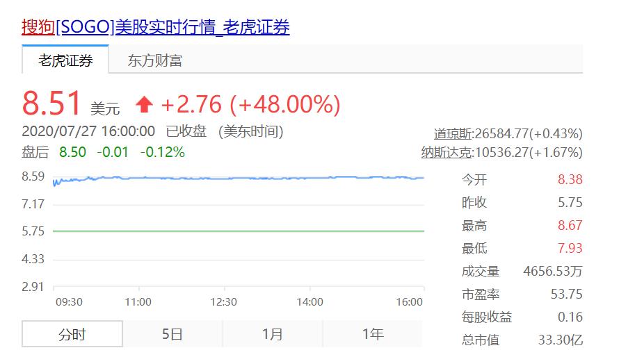 (消息一出,搜狗股价涨幅48%)