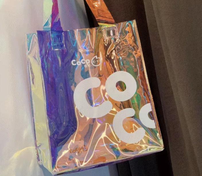 当传统纸袋/塑料袋在颜值赛道上奔跑,也有品牌将目光转向别的材质。有品牌把袋子做成PVC材质透明袋/镭射袋和帆布包。