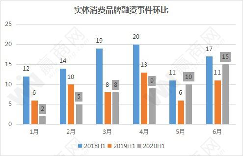 在一季度,实体消费品牌单月投融资事件分别为2、5、8,均处于三年同比低位,但往后逐月恢复走势明显。到了6月份,融资事件为15起,高于2019年同期的11起,与2018年同期的17起基本持平。