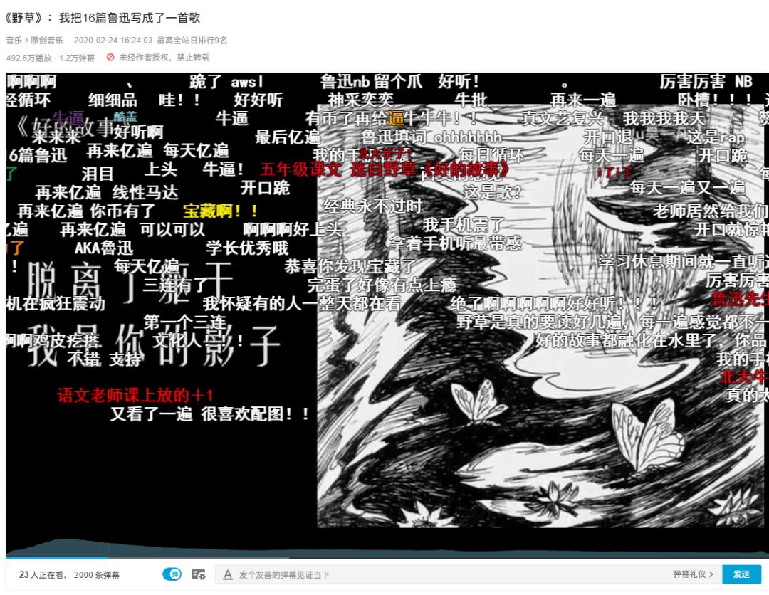 这些有表达欲的UP主中,也涌现出了一批rapper。比如北大学霸吴一凡,把鲁迅的16篇作品写成了《野草》,最终火上了微博热搜,登上了B站的夏日毕业歌会,与李宇春、毛不易同台;暴走杰里JERRYZ为2020高考学子创作的《你对你的潜力一无所知》,也得到了主流媒体的点赞;某幻君和老番茄合作的两支说唱视频,目前B站播放量也已突破1000万。