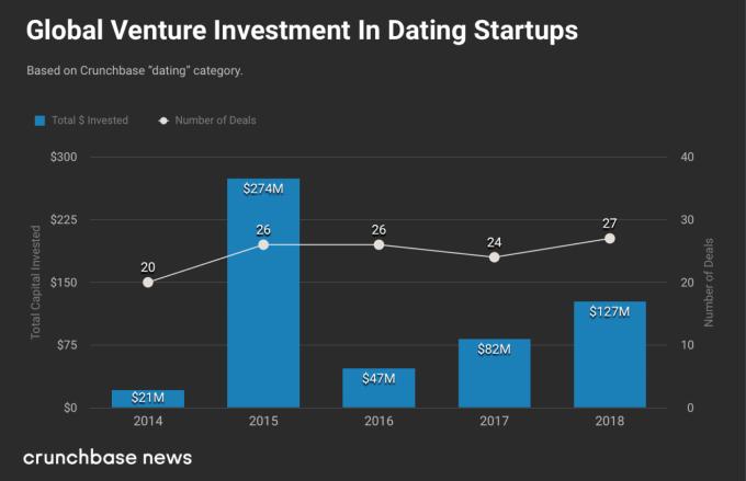 根据TechCrunch数据,2018年全球仅有27家主打约会的公司获得了1.27亿美元的融资👇