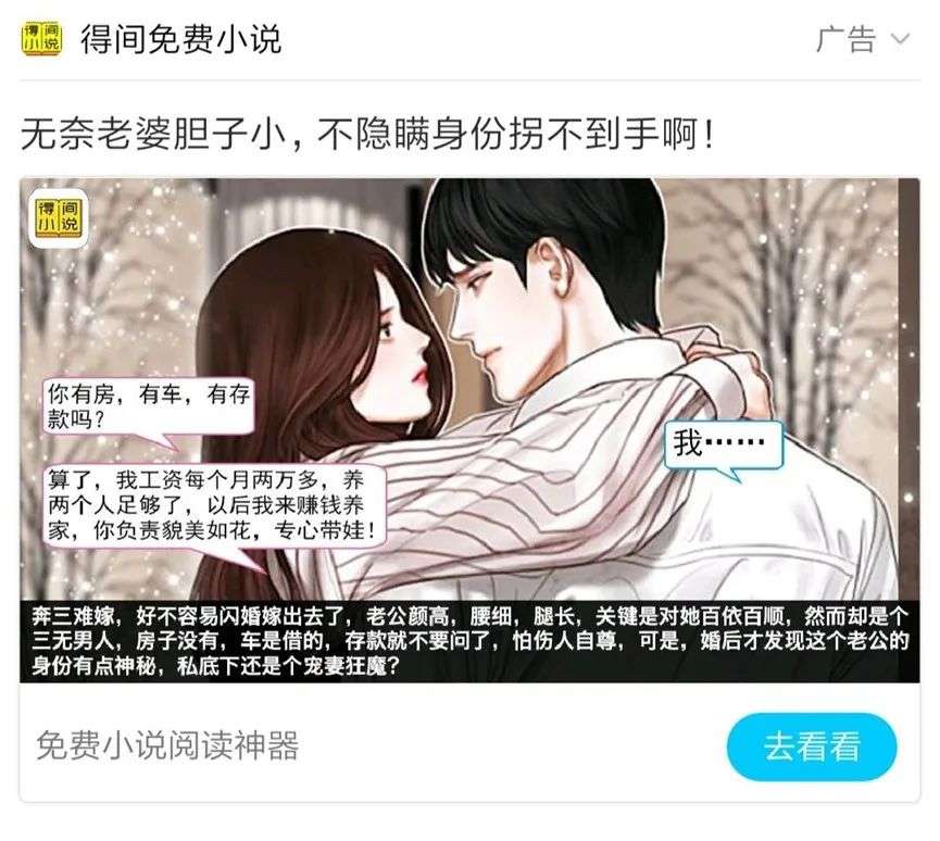 目前图片类仍是免费网文平台的主要买量广告模式。这些网文买量广告的内容来自小说情节,以引流文案吸引读者,这一点倒是比网游广告和游戏之间没有半点联系要强。随着短视频平台的崛起,文字内容的视频化短片逐渐出现,视频化短片的素材来源仍是小说本身,如《超级上门女婿》短视频一样。