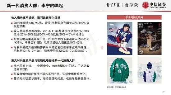 时尚越来越重要,李宁是个特别好的例子,李宁是个专业运动品牌,但相比安踏在产品上面会更加时尚,包括推出了中国李宁这样一个潮牌,跟华晨宇签订了代言,华晨宇的粉丝应该是以95后和00后为主的。它还以中国传统文化来不断地往自己的产品上面去做一些设计结合,最近推出的敦煌系列,是把敦煌的元素很好地结合到了自己的产品里面去。