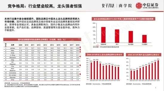 从海外的竞争格局来看,运动鞋服行业也会反映出集中度相对偏高的特征,总体来说,运动品类相对于其他服装品类具有天然的高集中度。