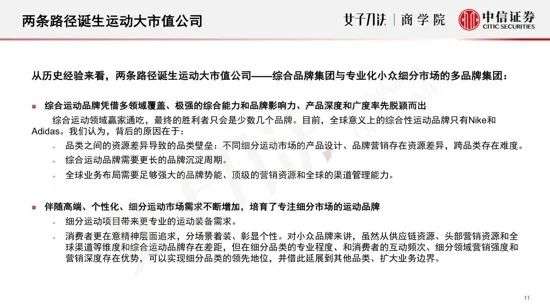 对这种品牌来讲,中部、腰部的品牌基本上没有机会去赞助、去绑定这些最头部的运动员,这就意味着我们如果想做一个综合性的运动品牌,难度跟壁垒非常高。所以耐克即便现在它增速不快,但是市场估值仍然不低,有二十倍左右。