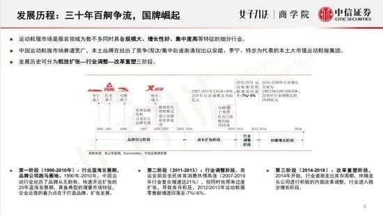 第一阶段(1990-2010年):从无到有,即老百姓开始有这种需求。九十年代以前,中国几乎没有专业做运动鞋服的品牌,此后,随着各大品牌开始在中国福建、晋江一带建厂,中国人对运动鞋服的需求也渐渐诞生。这个阶段是行业蓝海发展期,具备典型的增量市场特征,企业的着力点在于打造品牌、扩张发展。