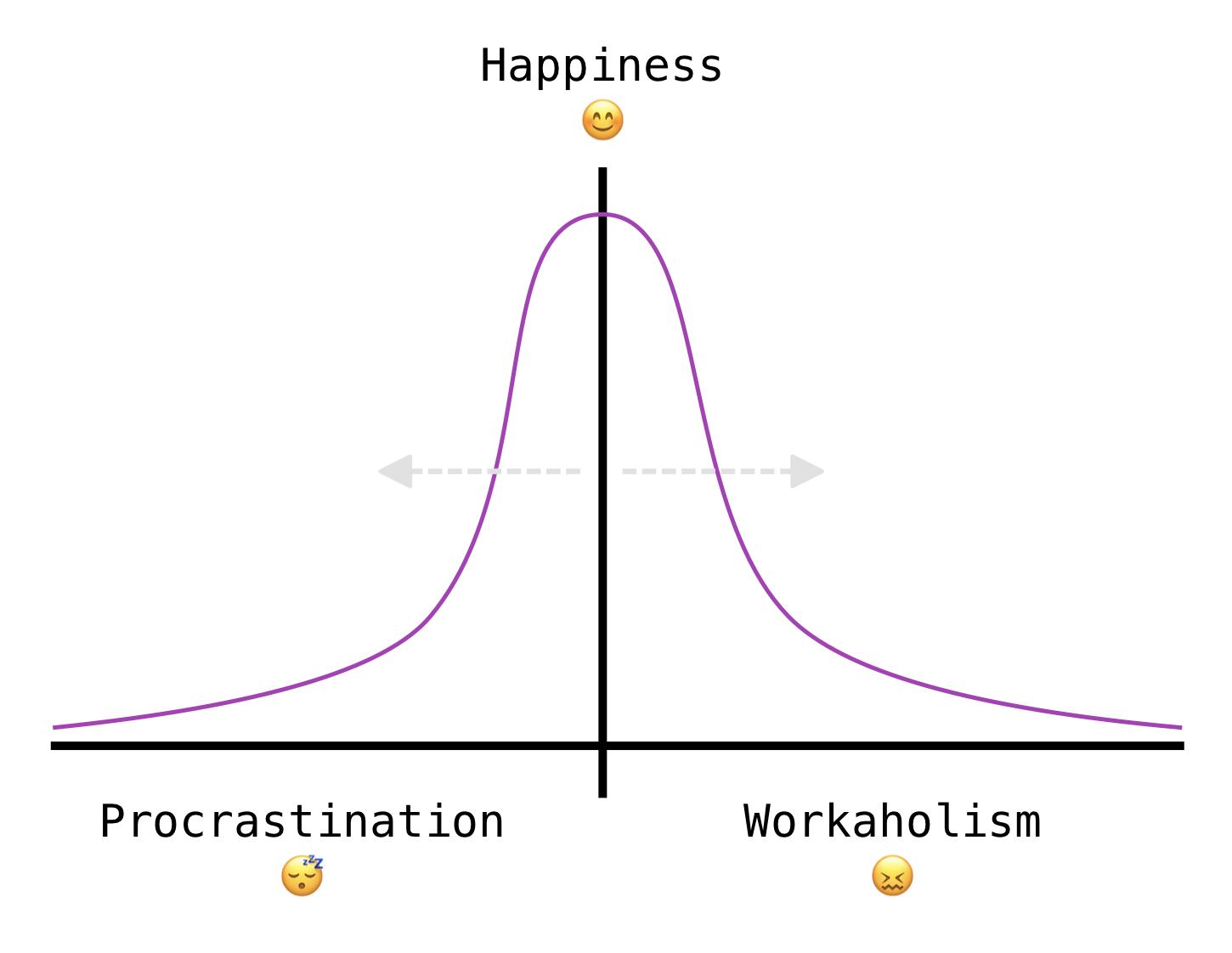 今年早些时候,我处于上图中左下角的某处。为了向右边转变,我必须解决我的拖延症问题。由于我之前尝试过的任何方法都不适合我,我决定学习一切关于这个问题的知识,并挑战自己,写一本关于这个问题的书!我试图向自己(和他人)证明,生活在幸福的曲线中间地带是可能的,一个可以让你富有成效同时保持快乐的地方。