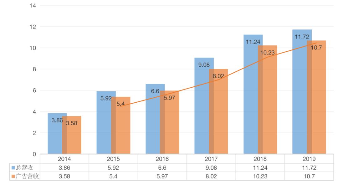 营收贡献超90%的互联网广告业务,从2017年至今,增长速度逐年放缓,最高不过11.7亿美元,才不到腾讯系营收的零头,大约只有百度广告营收的10%。