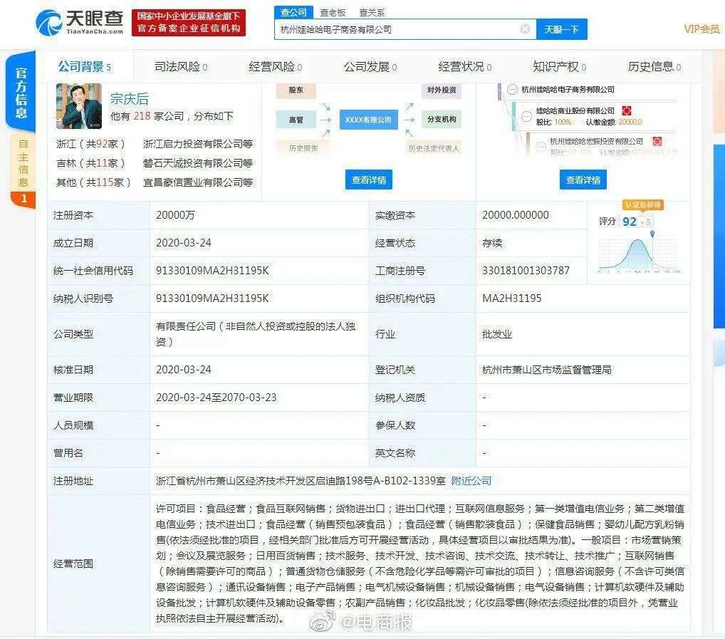 而今年3月,娃哈哈集团成立了电子商务公司:杭州娃哈哈电子商务有限公司,由娃哈哈商业股份有限公司全资持股,注册资本2亿元。