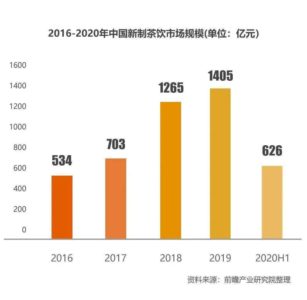 其次,受疫情影响,2020年茶饮市场大幅度缩水。2019年,新茶饮市场规模达到1405亿元。而2020年上半年,茶饮市场规模仅为626亿元。