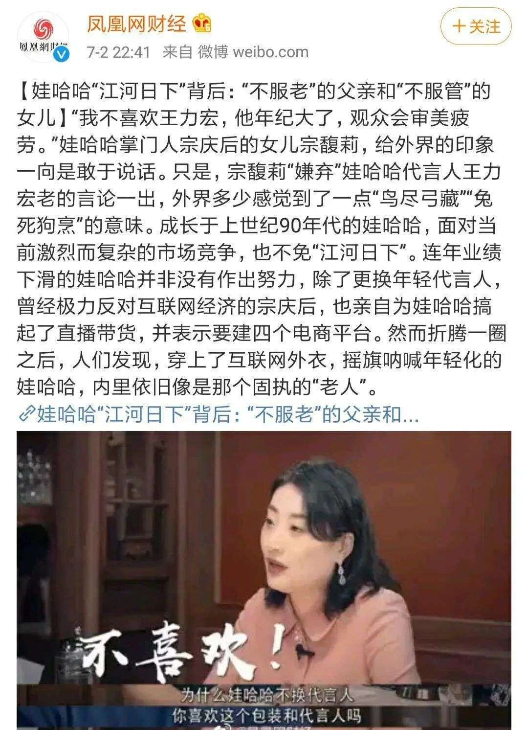 娃哈哈不是没有注意到这一问题。前段时间,娃哈哈解约王力宏也是出于品牌形象的考虑。娃哈哈新一代掌门、宗庆后的女儿宗馥莉甚至直言:“王力宏年纪大了,观众会审美疲劳。”在当时甚至引起了一波舆论危机。