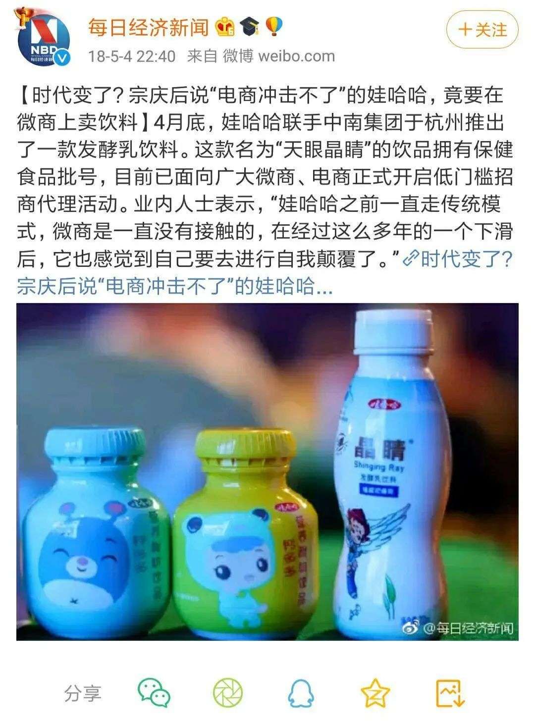 随后,娃哈哈与杭州中南天眼科技公司合作推出新品“天眼晶睛”发酵乳饮料,面向微商、电商开启低门槛招商代理活动。