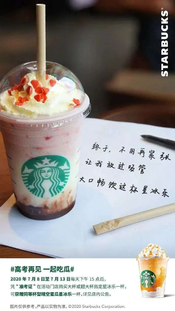 7月8号-13号,星巴克也做了次买一送一。只要在每天15:00后凭“准考证”,无论是打印还是手绘的均可,到门店购买大杯或超大杯限定款星冰乐,送一杯晴空蜜瓜星冰乐。