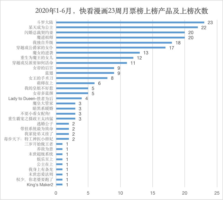 2020年上半年,快看漫画月票榜Top10的国产漫画共有33部作品,仅有《斗罗大陆》一部作品连续23周在榜,在榜10周及以上的作品共9部,包括《某天成为公众》《闪婚总裁契约妻》《魔道祖师》等。