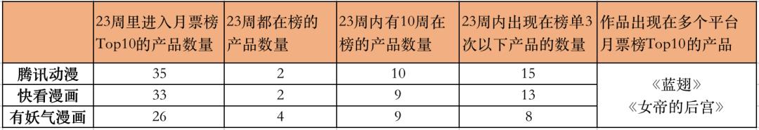同比2019年同期,三个平台的头部作品重复率更低,仅有《蓝翅》《 女帝的后宫》两部同时位居两个及以上漫画平台的月票榜Top10;