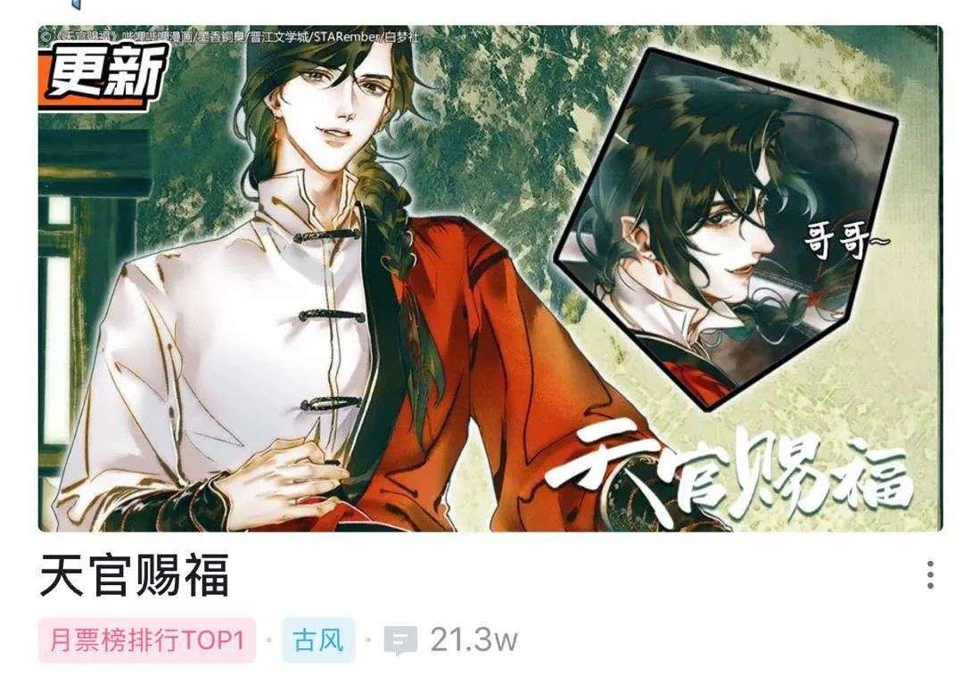 《天官赐福》是墨香铜臭的第三部作品,双男主,小说拥有超高人气,同名漫画于2019年10月19日开始在哔哩哔哩漫画连载。上线不足两个月,就将2019年哔哩哔哩漫画年度出圈作品、年度热搜作品、年度应援最强作品和年度热议作品四个奖项收入囊中。基于网文IP改编的动画化作品,也将在今年10月开播。