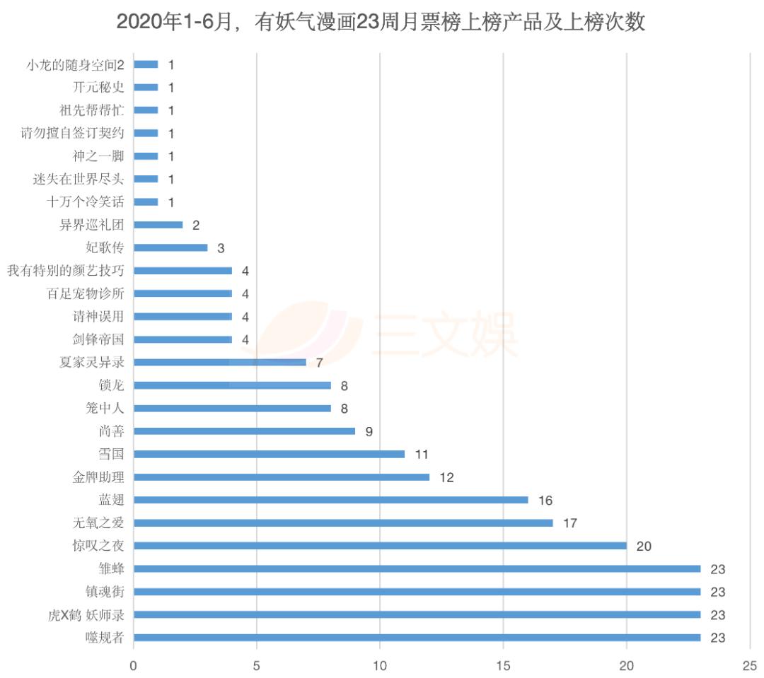 23周里只有26部作品登上过畅销周榜Top10,有9部作品在榜10周及以上。比如,《镇魂街》《噬规者》《雏蜂》《虎X鹤 妖师录》连续23周在榜。这些作品,几乎都为有妖气独家的超人气漫画作品。