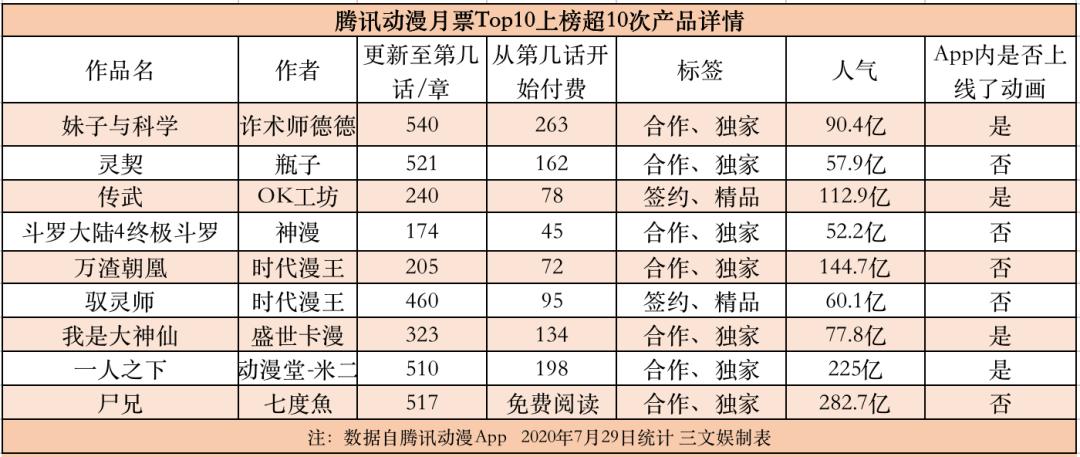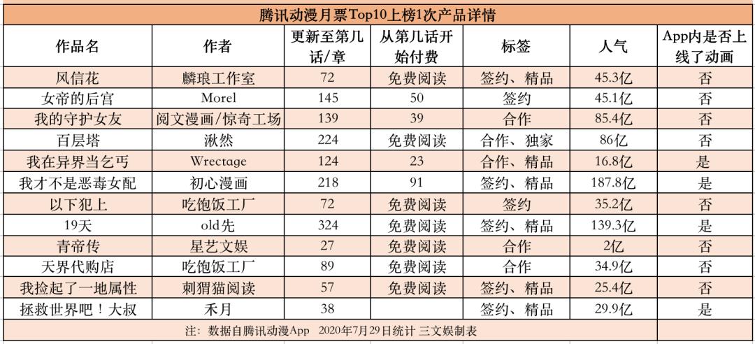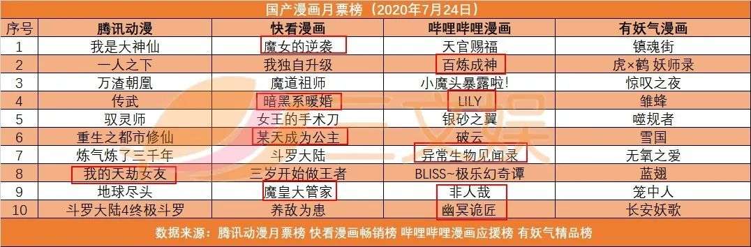 来源:腾讯动漫月票榜全站,快看漫画畅销榜,有妖气月票榜