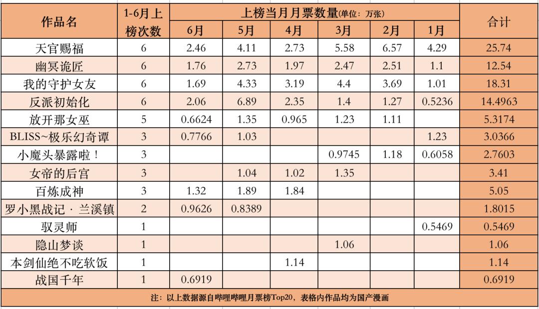 月票榜Top20有14部国漫入围,《天官赐福》半年月票25.7万张
