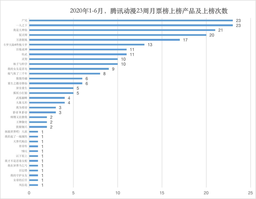 23周里,腾讯动漫国产漫画月票Top10的产品共有35部。其中,《尸兄》《我是大神仙》两部作品连续23周在榜,《万渣朝凰》《百炼成神》两部作品分别有21周和20周在榜。