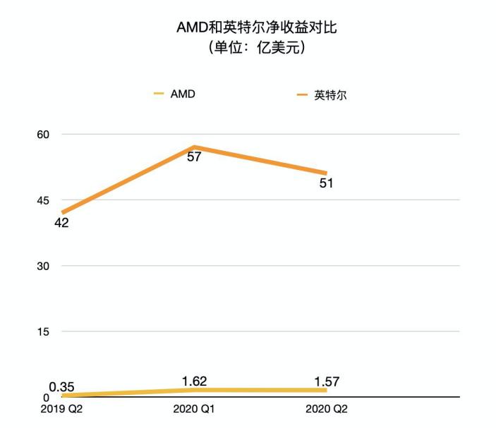 在净收益方面,英特尔和AMD同样也都比较稳定,虽然相比Q1都有所下降,但比2019Q2都有较大提升。英特尔净收益51亿美元,同比增长22%;AMD涨势更猛,净收益1.57亿美元,相比2019 Q2的0.35亿美元同比增长了349%,不过这也和AMD体量较小有关。