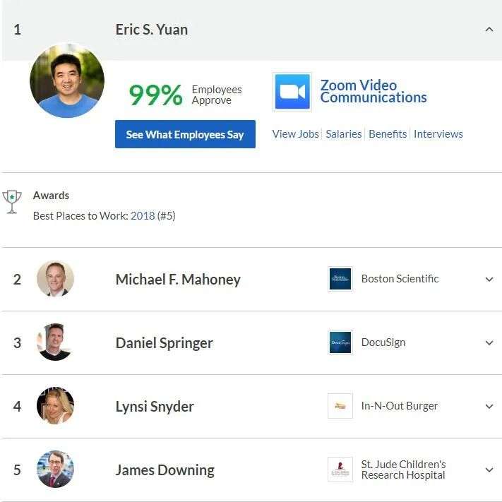 2018年,美国职场研究调查公司Comparably根据全美5万家公司的1000万名员工提交的职场幸福调查答卷,评出员工幸福感最高的25家公司,Zoom名列第一。同年7月,美国求职网站Glassdoor评出了全美100强CEO榜单,第一名不是扎克伯格,也不是苹果CEO库克,而是Zoom创始人袁征(Eric S.Yuan),袁征以99%的员工好评率夺冠,成为首次荣登榜首的非白人CEO。