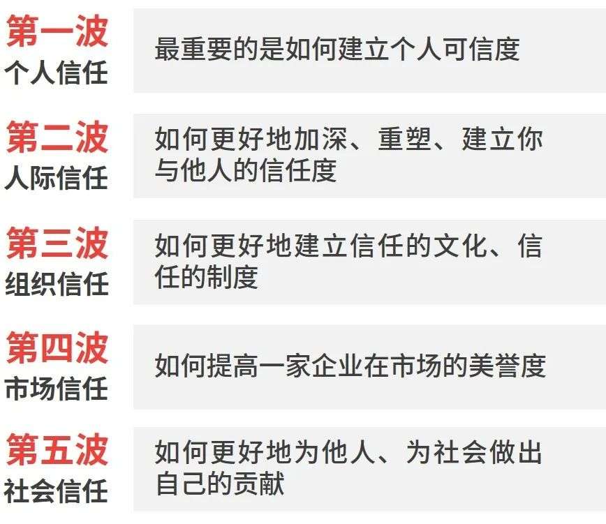 在《信任的速度》中,信任分为五个层面,就像一滴水滴入水塘,慢慢蔓延开来。