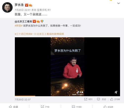 具体来说,就是樊登有一段视频,分析罗永浩为什么会失败,讲得头头是道。但老罗不屑一顾,一句“我靠,又一个吴晓波......”甩给了樊登。