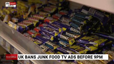 英国癌症研究中心称,英国各大电视频道的食品广告中,近一半来自高脂肪、高糖、高盐的垃圾食品。而在晚间6点到9点的黄金时段,60%英国儿童可能观看到这些广告。
