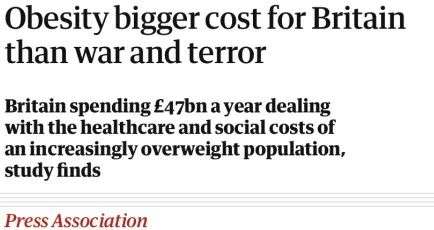 英国媒体评价,英国每年因暴力、战争和恐怖主义遭受的损失不过430亿英镑,肥胖造成的代价,甚至大过战争和恐怖主义。然而,英国每年在用于肥胖预防计划的支出甚至不到6.38亿英镑。