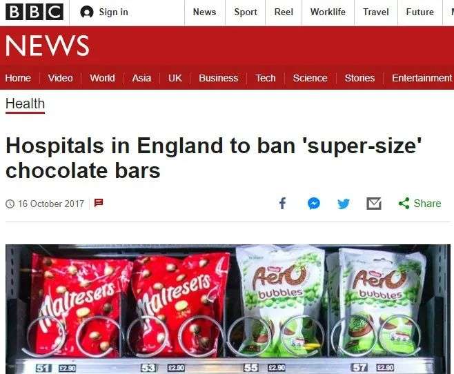 2017年BBC报道,英国医院禁售超大号巧克力棒