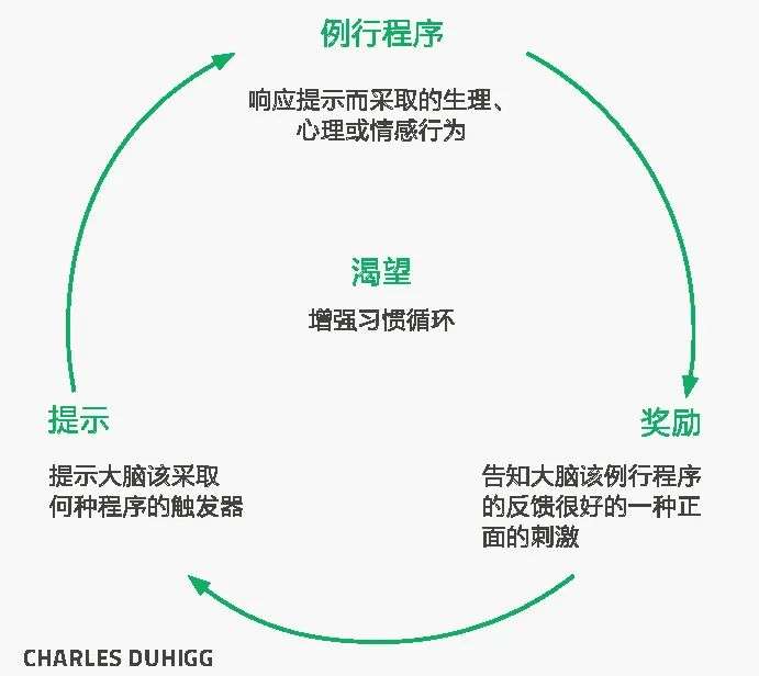 在《习惯的力量》中,查尔斯·杜希格(Charles Duhigg)深入研究了有意识决策的对立面,即我们日常中50%的行为纯粹基于习惯。根据麻省理工学院的研究,他将习惯描述为自发行为的自我强化循环。此循环包含三个关键因素:提示,例行程序和奖励。“提示”是一个外部事件,它充当触发器,而例行程序则是响应该提示而采取的动作。