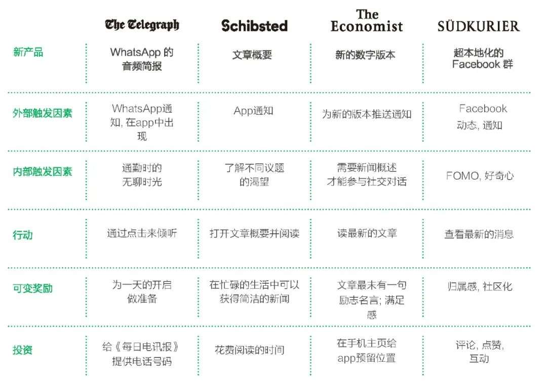 根据我们在顶尖出版商的采访中获得的经验,我们开发了新媒体产品的“习惯”蓝图,将习惯形成的因素应用于新媒体行业,如下图所示。