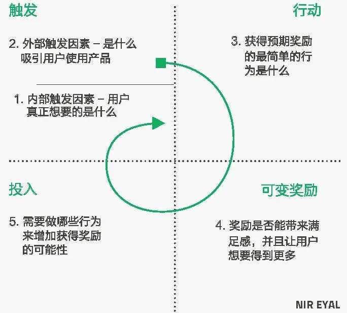 与此相似的,尼尔·艾亚(Nir Eyal)在《上瘾》中开发了上瘾模型,来创造习惯形成产品。该模型包括四个步骤:触发,行动,可变的奖励和投入。在上瘾模型中,Eyal区分了外部触发因素(例如我们在周围看到或听到的事物)和内部触发因素(例如情感)。在触发之后,用户采取行动以期获得奖励。