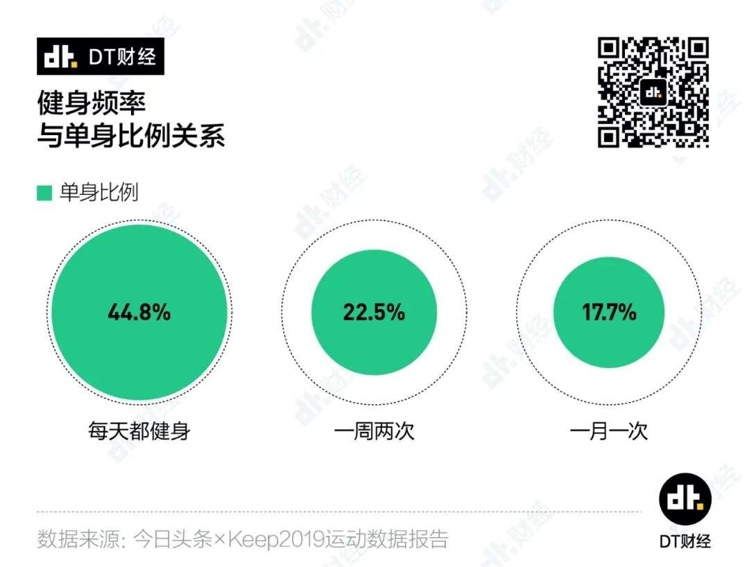 每月健身1次的健身小白中,单身比例为17.7%;每周2次的健身人群里,单身比例为22.5%;每天都健身的达人们,健身房里的小哥哥小姐姐们注意了,看上了就去勇敢勾搭吧,因为他们中接近一半的人都没有对象。