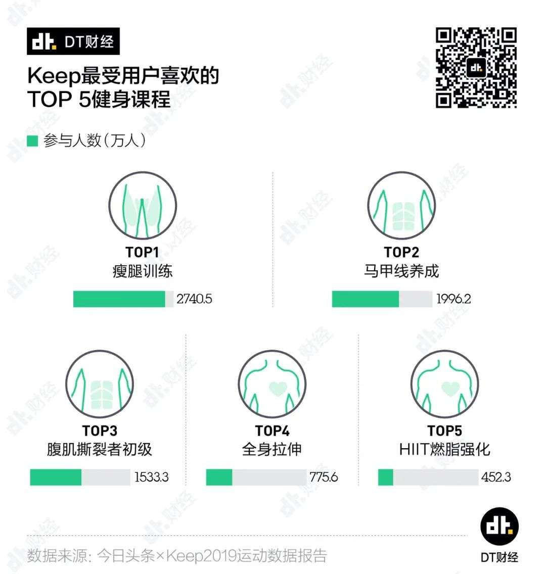 以Keep上的课程为例,参与人数最多的课程是瘦腿训练,有2740.5万人希望健身能给自己好看的腿部曲线;其次是腹部养成,超过3500万人想给自己一块好看的腹部。社交网站上动不动就有人“炫腹”的背景下,把肚子上的肥肉变成马甲线,已经成了健身的入门要求之一。