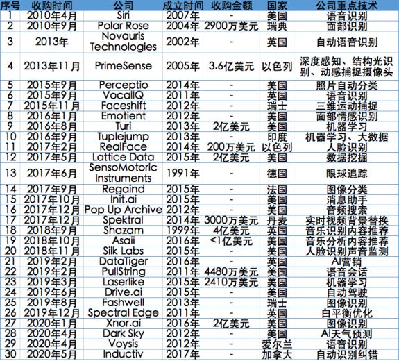 根据机器之心整理,在苹果公开披露收购案例和金额的30家公司中,Shazam、primeSense的金额为最高,其次是Turi、Lattice Data、Xnor.ai这三家美国AI公司,收购金额均为2亿美元,其余未超过1亿美元。