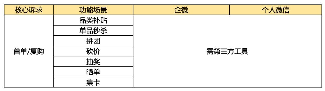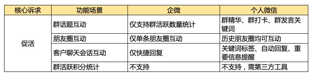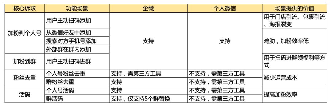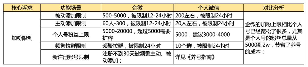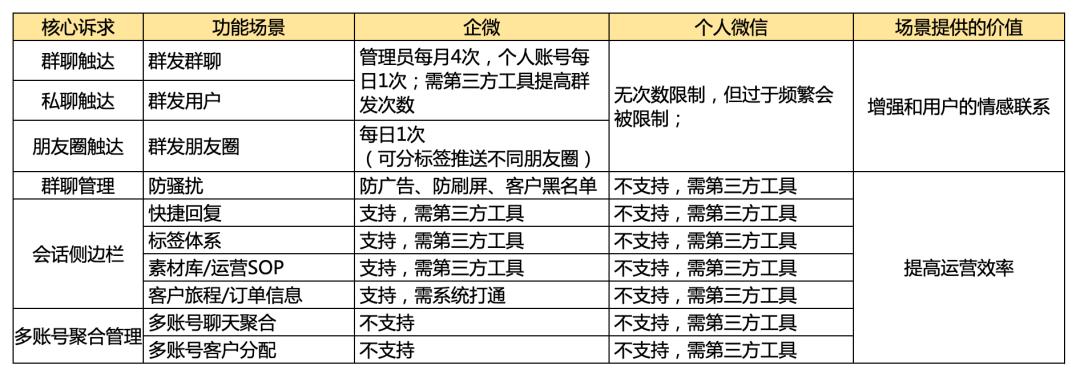 这块企微和个人号也是有极大的不同的,为此我们也做了一个表格:
