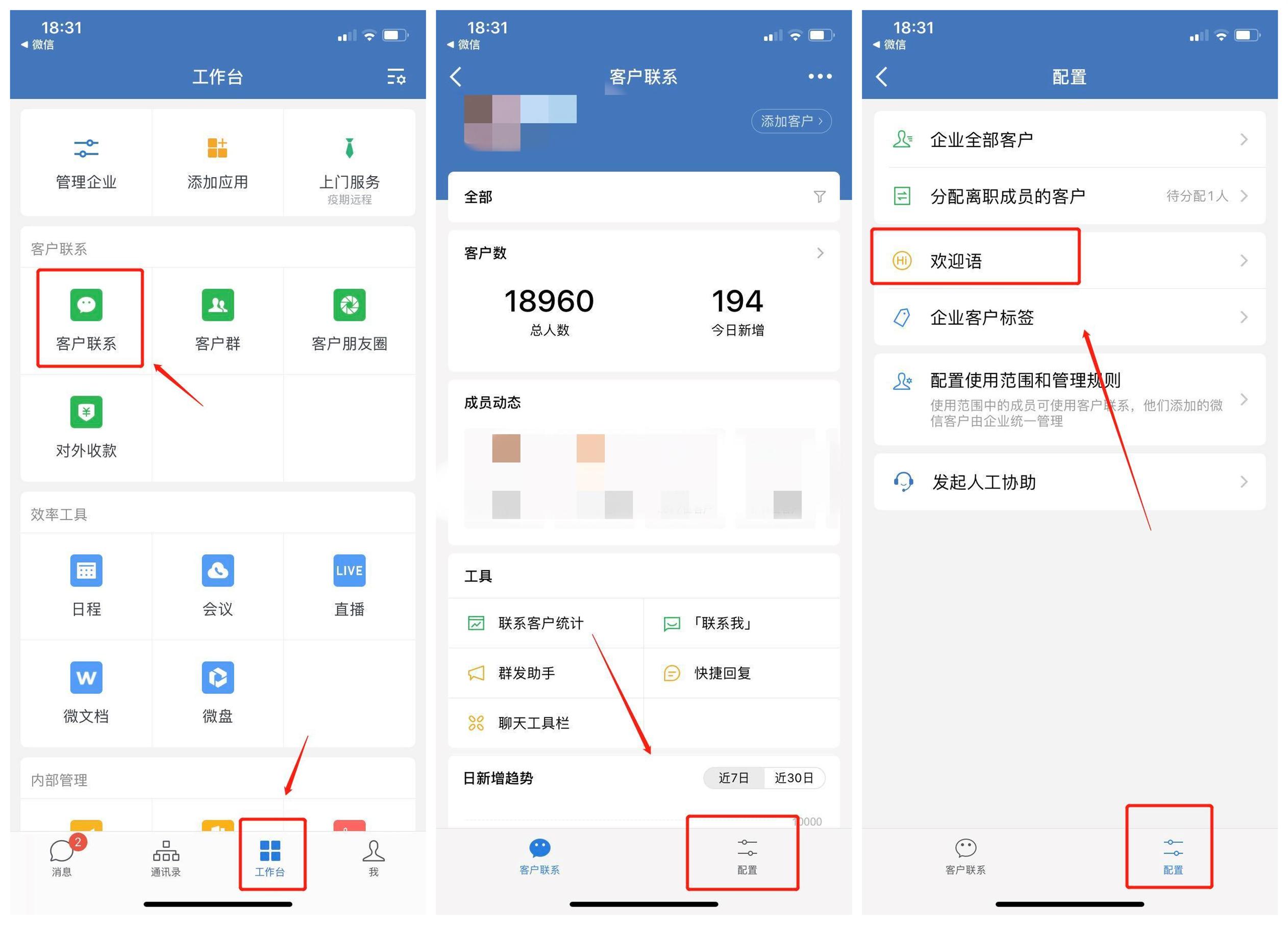 首先在网页端:客户联系-配置-配置使用范围和管理规则;设置好了之后再打开,手机端:工作台-客户联系-配置-欢迎语