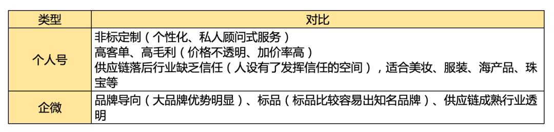 总的来说,人设打造是私域打法中至关重要的一环,决定了目标用户和选品的效果。而由于企微的朋友圈限制、强品牌标示,导致企微的使用场景会跟个微私域差异巨大: