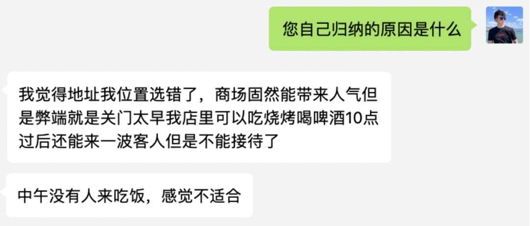 店老板归因为选址,但这不是主要原因,因为通过之后的询问,了解到临近几个餐饮店活得非常好,而且那个商场客流足够,菜品价格接受度也较高。