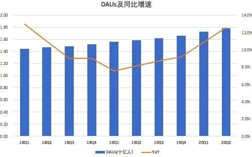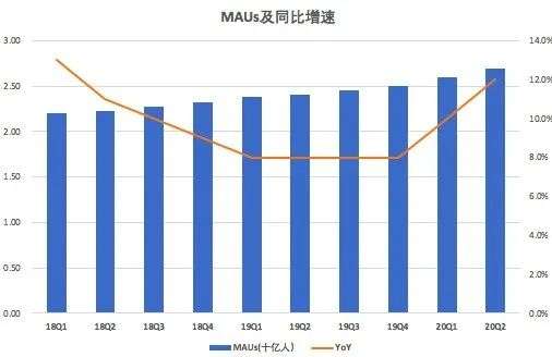 财报显示,截至2020年6月30日,月度活跃用户人数为27.0亿人,比去年同期的24.1亿增长12%,比一季度的26.0亿人增长3.8%。