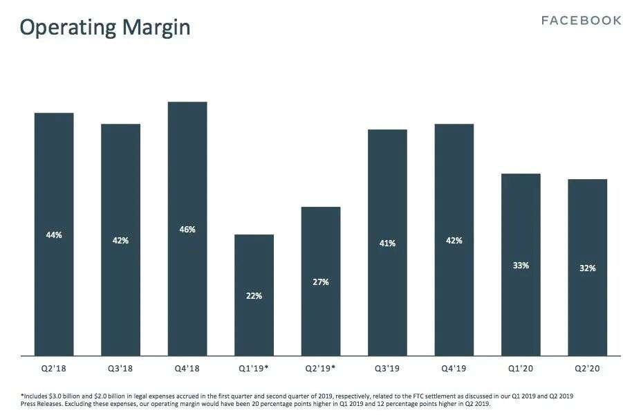财报数据显示,二季度Facebook的净利润为51.78亿美元,比去年同期的净利润26.16亿美元增长98%;运营利润为59.63亿美元,比去年同期的46.26亿美元增长29%;营业利润率为32%,而去年同期的营业利润率为27%。