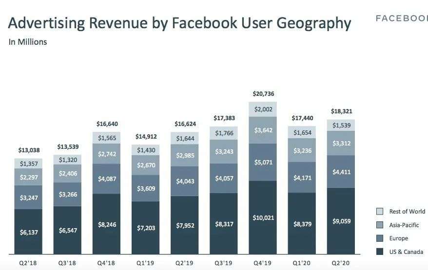 自全球疫情爆发以来,Facebook日活用户和月活用户,均在Q1和Q2都保持了2位数的同比增长。突发的疫情让人们线下活动减少,因为用户把更多的休闲方式从线下转移到线上,这也为Facebook带去了更多的用户量和广告点击量。