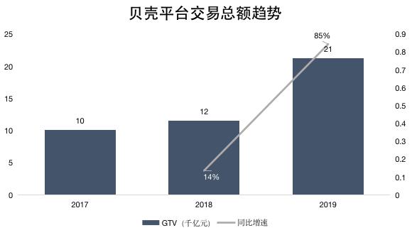 争议之后,贝壳的步子越迈越大。受益于房地产这一产品高客单价的特殊性,从平台成交额的角度来看(GTV或GMV),经过两年发展的贝壳,已经成为继阿里巴巴之后的中国第二大商业平台。