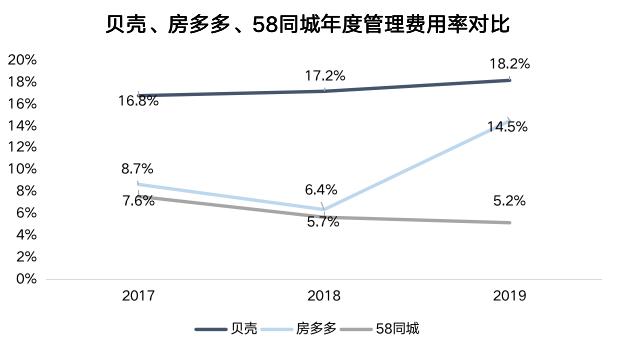 贝壳的三费当中,包括参与企业员工工资、办公室费用、招聘及培训等在内的一般管理费用是它最大的支出项。与去年上市的房多多、“老对手”58同城相比,虽然同处于房地产经纪行业的大盘子里,贝壳的管理费用率却是最高,且还在持续增长。